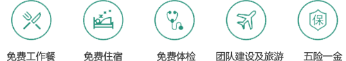 免费工作餐、免费住宿、免费体检、团队建设及旅游、五险一金、各类补贴(通讯补贴、交通补贴、节日福利、生日福利、高温补贴)等完善的福利体系。
