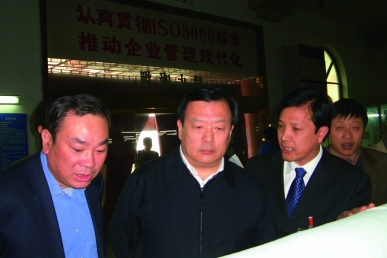 中共浙江省委书记(时任省委副书记)夏宝龙和中宣部常务副部长(时任中共浙江省委常委、宣传部长)黄坤明在浙江尊龙凯时经编股份有限公司车间