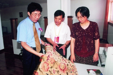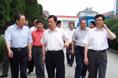 中宣部常务副部长、中央文明办主任(时任中共嘉兴市委书记)黄坤明(左一)在浙江尊龙凯时经编有限公司指导工作