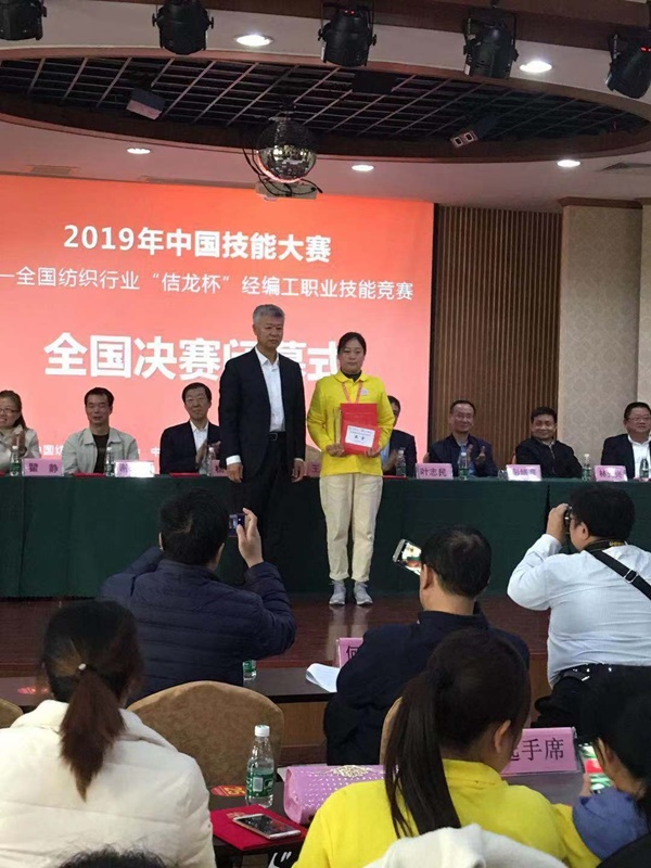 2019年12月8日,由中国纺织工业联合会主办,中国针织工业协会承办的2019年全国纺织行业“佶龙杯”经编工职业技能竞赛在福建晋江举行,尊龙凯时高科控股股份有限公司织造部派出的两名员工在比赛中表现出色、喜获佳绩。