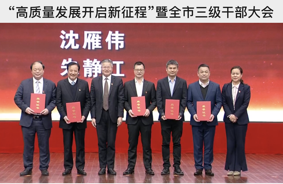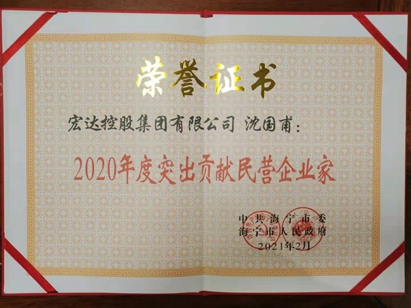 2021年2月19日上午在海宁市“高质量发展开启新征程”暨全市三级干部大会上,公司董事长沈国甫同志荣获”突出贡献民营企业家“,市委书记曹国良为沈董事长颁奖。