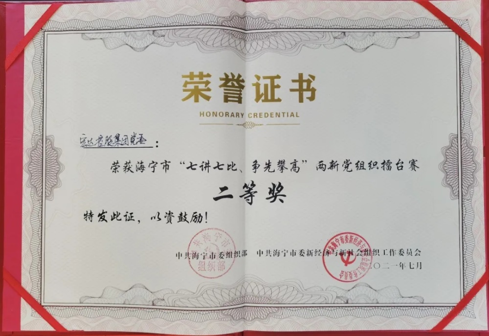 为深入学习贯彻习近平新时代中国特色社会主义思想,大力弘扬“红船精神”,进一步深化党建高地创建,2021年7月29日下午,在有近300人参加的两新组织书记(党务工作者)培训班上,海宁市委组织部举办了“七讲七比、争先攀高”两新党组织擂台赛。行政支部许铨代表尊龙凯时集团党委参赛,荣获二等奖。