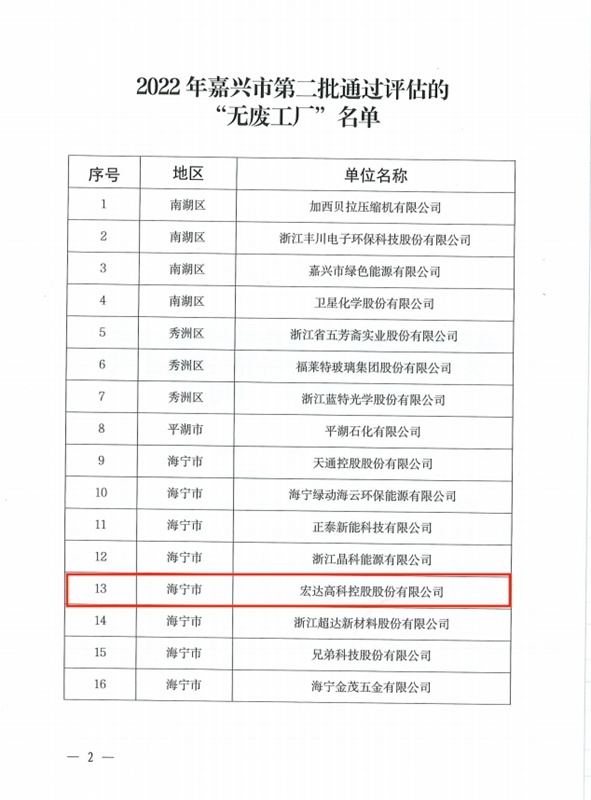 近日,根据嘉兴市生态环境局和嘉兴市经济和信息化局文件,尊龙凯时高科被评为2022年嘉兴市第二批“无废工厂”。