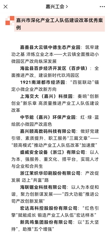 据了解,本次案例评选是嘉兴市全面启动新时代产业工人队伍建设改革以来,各地各单位结合产业、行业、企业特点和区域特色,聚焦聚力非公企业和小微企业园区,积极开展探索创新实践,全面协调推进全市产改工作实现了点向面转换、表及里深化的良好态势,培育形成了一批不同类型、有示范带动作用、经验可复制可推广的工作样板和优秀案例。经嘉兴市市产改协调小组办公室认真评审,研究确定了嘉兴市深化非公企业产业工人队伍建设改革十大工作举措、嘉兴市镇街(园区)深化非公企业产业工人队伍建设改革十大样板、嘉兴市非公企业产业工人队伍建设改革助力共同富裕典范城市建设十大案例和17个优秀案例。