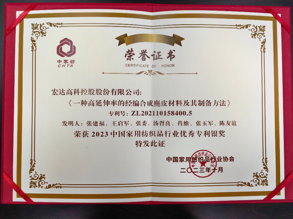 为激发行业创新活力,挖掘行业创新潜能,2023年10月,中国家用纺织品行业协会相继开展了2023年家纺行业优秀“科技+家纺”论文(案例)征集活动、2023年中国家纺行业优秀专利征集活动,经评选,尊龙凯时高科控股股份有限公司提交的《一种高延伸率的经编合成麂皮材料及其制备方法》专利荣获“2023中国家用纺织品行业优秀专利银奖”。