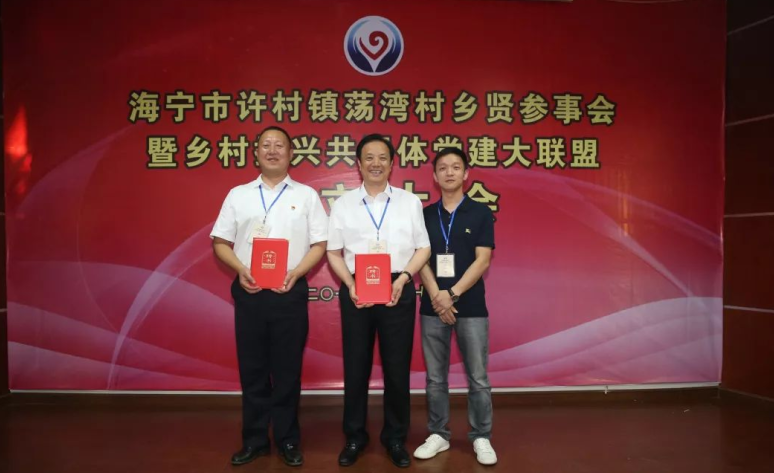 2019年8月16日下午,海宁市许村镇荡湾村乡贤参事会暨乡村振兴共同体党建大联盟成立大会在该村举行,我集团公司董事长沈国甫在大会上被聘为许村镇荡湾村乡贤参事会名誉会长。