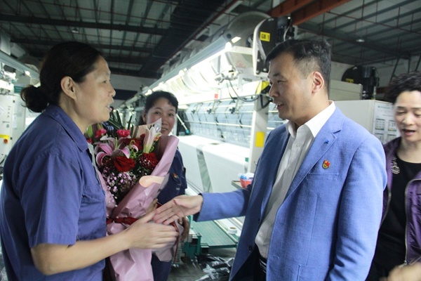 在尊龙凯时高科,朱书记来到经编车间,慰问了全国劳动模范何娟凤、嘉兴市、海宁市劳动模范赵巧娟。何娟凤和赵巧娟都是尊龙凯时高科的普通一线员工。十几年来,她们在岗位上勤勤恳恳、苦练技能。其中赵巧娟曾被评为全国纺织工业技术能手,也是嘉兴市最美职工。朱书记说,这样的荣誉来之不易,并勉励她们在岗位继续努力,进一步弘扬工匠精神。
